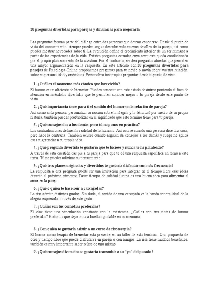 Pruébalas en tu lugar de … El uso de las dinámicas para adultos en tu iglesia , campamento o velada tiene muchísimas ventajas , de las cuales podemos destacar la integración. Vamos a necesitar una pelota, así como un reproductor de música. ¿cuáles son tus planes de vida? A continuación una serie de preguntas para un novio de los más divertidas, atrevidas e íntimas. Herramientas para crear exámenes online para docentes. Dos verdades y una mentira. Una manera de ir conociendo a los integrantes de los mismos, rompiendo el hielo a modo de presentación y con preguntas muy originales. Perfecta para trabajar con pequeños grupos. Las dinámicas para "romper el hielo" resultan útiles en eventos de team building donde los asistentes no se conocen porque proporcionan un punto de partida, un comienzo para empezar a soltarse y que luego sea más cómodo para todos hablar al resto del grupo. Los alumnos, mediante preguntas, deberán intentar averiguar qué significado tienen los datos para el maestro/a. Por ejemplo, si en una de las puntas está escrito 31, este. Las 70 mejores frases sabias de la historia 1. Los alumnos podrán seleccionar la respuesta correcta de entre una serie de opciones y, después, comprobar si han acertado …